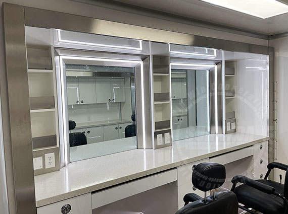 Premium hair & makeup trailer: luxurious, self-sufficient mobile studio for top-tier film, TV, and events. Dual slide-outs + 2100mm high ceilings create an exceptionally spacious, airy workspace for multiple artists/talent. Reverse-cycle roof A/C for year-round comfort; pro LED + skylights ensure perfect color accuracy. Features premium styling chairs (multiple configurations available), kitchenette (fridge + convection microwave), and private external-access restroom. Available for rent or purchase. We offer full design service and custom manufacture to your exact specifications - the turnkey upscale choice top producers rely on to keep talent camera-ready and productions on schedule.